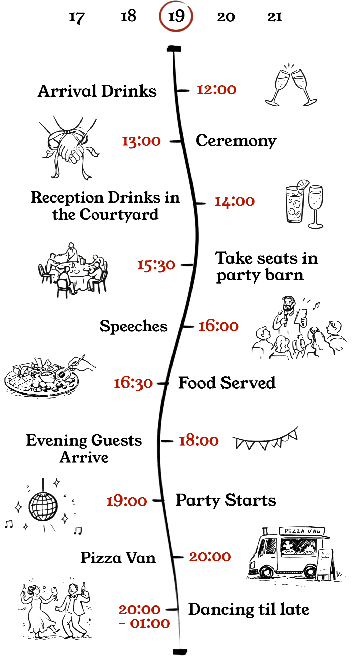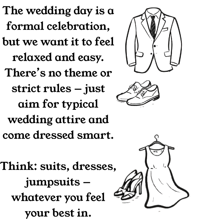 Below you’ll find all the practical bits for the day — how to get here, what’s happening when, what to wear, gift info, and a few FAQs. Have a read, pack your dancing shoes, and get ready for a proper celebration.We’re very glad you’ll be part of it.